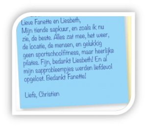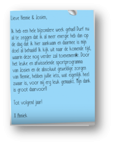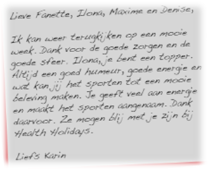 Tijdens het sportprogramma van Health Holidays kan iedereen zich inspannen op zijn/haar eigen niveau. Doe overal mee op een niveau waarvan u voelt dat u het aankunt. U merkt dan heel goed dat het elke dag beter gaat. Alles wat u doet, komt uw conditie ten goede. Houdt u er rekening mee dat uw lichaam veel rust nodig kan hebben om alle verstoppingen – het gevolg van jarenlang (veelal onbewust) onverantwoord eten – op te lossen en uit te scheiden. Luister daarom goed naar uw lichaam. Heeft u een keer uw dag niet, meldt dat dan aan de begeleiding en neem een ochtend of middag vrij.